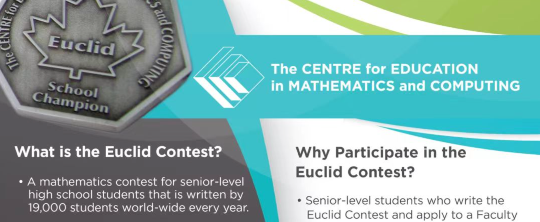 欧几里得数学比赛(Euclid mathematics contest)是由加拿大滑铁卢大学数学学院于1945年创办的一项全球性数学比赛。它是加拿大最具认可度的数学比赛之一,被广泛认为含金量极高。欧几里得数学比赛在国际上享有很高的声誉,被视为数学界的"托福"。许多美国和加拿大的名校将欧几里得数学比赛作为评估国际学生数学水平、入学资格以及奖学金发放的重要依据。滑铁卢大学招生官网甚至明确建议学生参加这